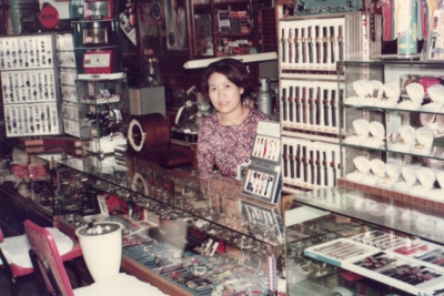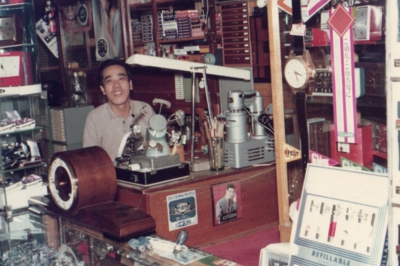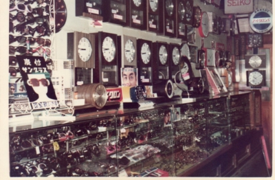 当時は、時計の販売の最盛期。壁面、ショーケースに時計がびっしり入っているのが分かります。