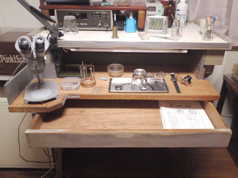 元々はセイコーサービスセンターで長年に渡って使われていた丈夫な時計修理机です。知人を通じて譲り受けて、当店の修理室に置かれています。