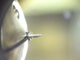 機械式時計のテンプの軸「天芯」を別作しているところです。顕微鏡で撮影してますが、先端の部分は、材料の鋼を髪の毛よりも細く加工しています。