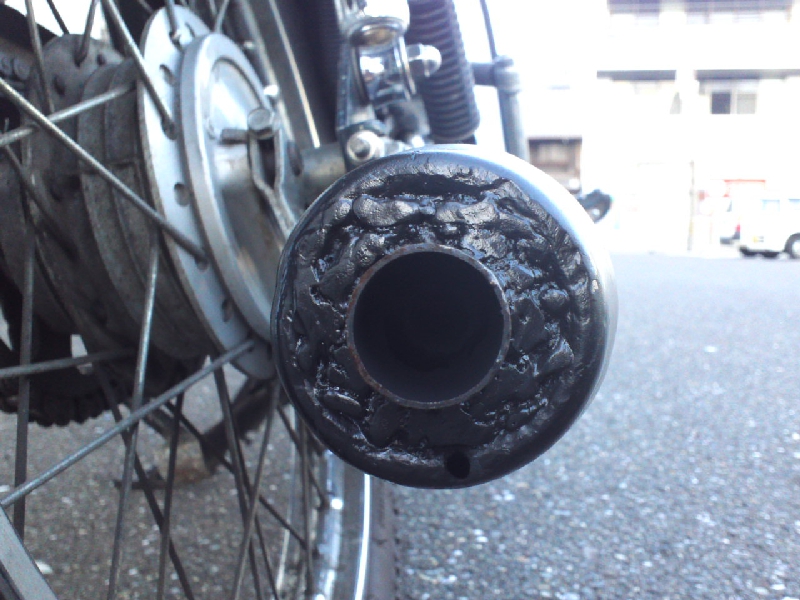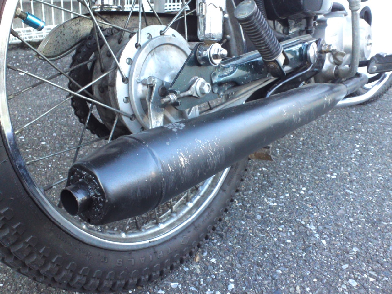 スポーティなマフラーに交換したことがあります。見栄えはいいのですが、このマフラーはスーパーカブには排気抜けが多すぎて、低速のトルクが無くなり、快適に走りにくくなってしまいました。結局、純正マフラーのマフラーエンドを拡大した状態が、一番、走行性能が優れていると思いました。