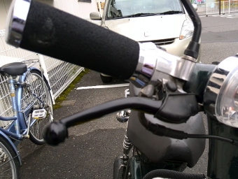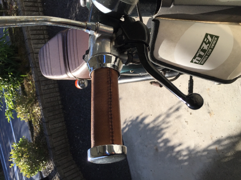 本革に変える前は、純正のゴムハンドルから、メッキパーツの付いたスポンジ素材のハンドルに交換して使用していました。これはこれで、柔らかく、握りやすいハンドルでした。スーパーカブ用のハンドルパーツは多数あるので、手軽に出来るカスタムとしておすすめです。