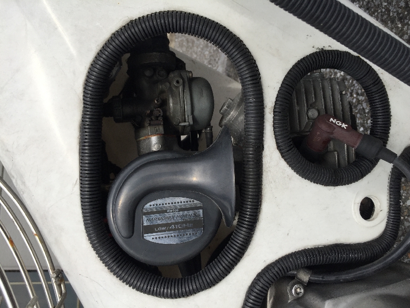 写真の中央付近にある二つのネジを回して、アイドリングと低速のギアで走っているときの燃料調整を行えます。季節の変わり目に、気温の変化に合わせてエンジンが安定して回転するところに合わせていました。素早く最適な燃調に合わせるには、ある程度、慣れが必要です。慣れてしまえば、あっという間にセッティングを合わせられるようになります。