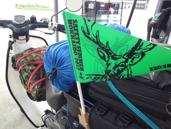 北海道のガソリンスタンドでは、道外から来たライダーに三角旗を配ってくれていました。早速、スーパーカブに三角旗を取り付けました。この時ばかりは、大量の荷物を積むためにスーパーカブにリアキャリアを付けていました。